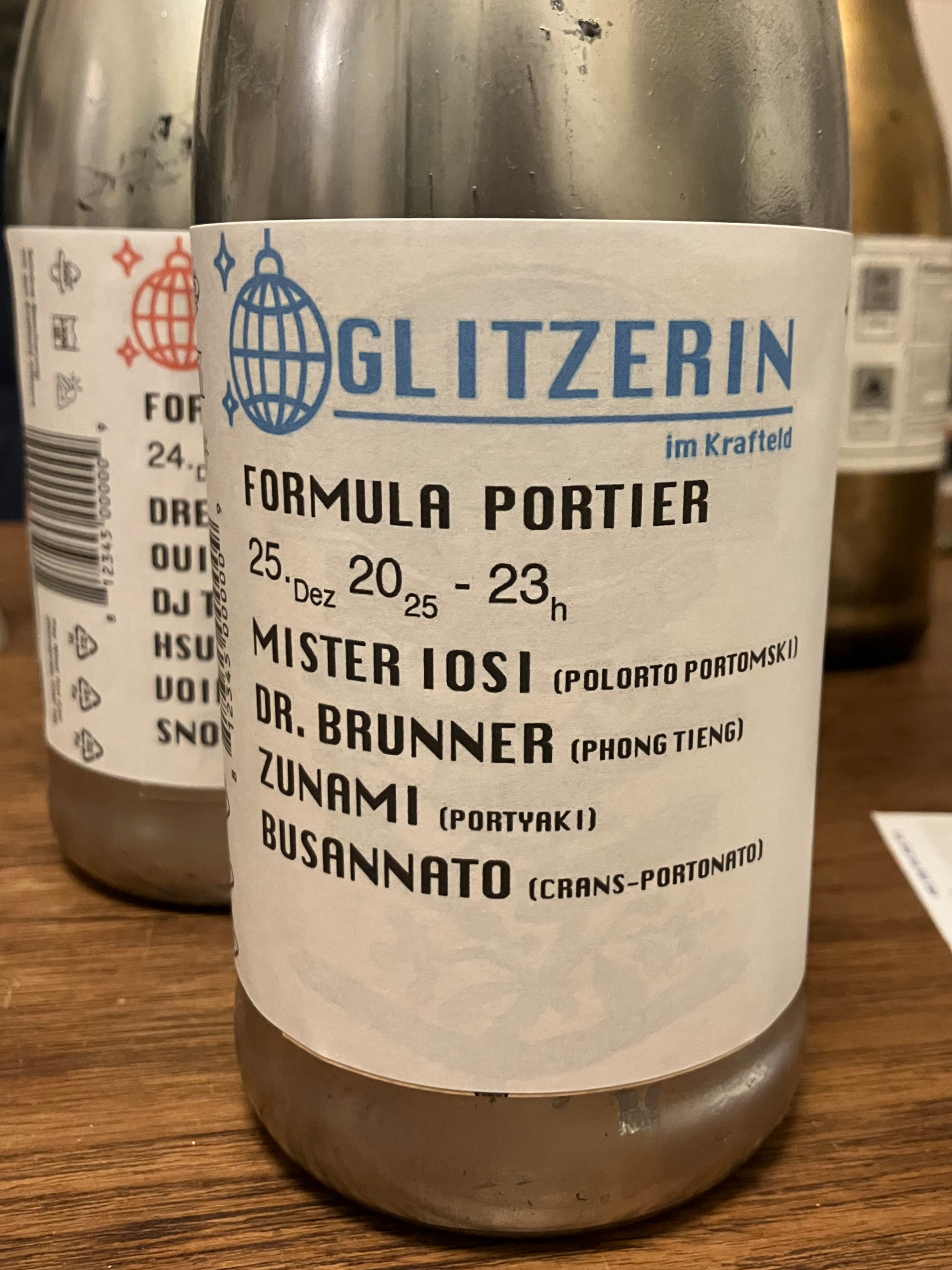Wenn im ganzen Festtagstrubel der Stress Überhand gewinnt, hilft nur eins: Der Griff zum Chemiebaukasten. Glitzerin! Wir wissen es und du weisst es: Nichts bringt dich um die Weihnachtszeit mehr zum Strahlen, Glänzen, Glitzern und Funkeln als eine ganze Kutschenladung voller DJs in deinem Lieblingsclub. Heute mit einer DJ-Delegation aus dem Portier: Mister Iosi, Dr. Brunner, Zunami und Busannato lassen ihre Plattensammlungen zu festlichen Laborbedingungen auf dich los. Egal wie fett der Znacht war, unser heutiges Lineup macht Bock auf musikalisches Dessert. Schmeisst die Espressotassen durch den Club und schreit Po! Po!