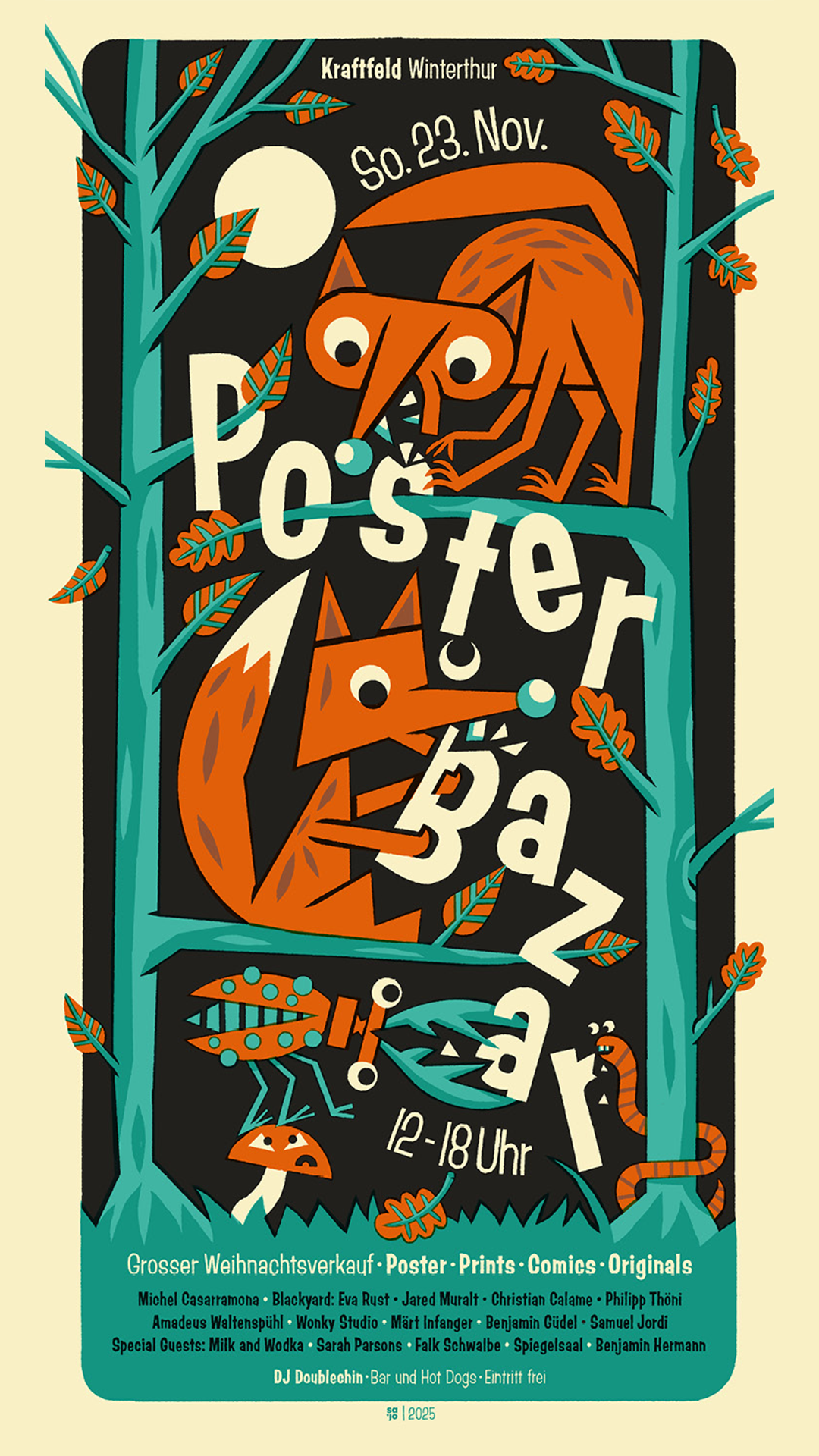 Der legendäre Poster Bazar macht wieder in Winterthur Halt. Eine illustre Zusammenkunft angesehener Schweizer Illustrator:innen verkauft heute ihre abgefahren-tollen Kunstwerke; wer zu Hause leere Wände hat oder noch Weihnachtsgeschenke sucht, horche auf!