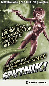 Für all die bemitleidenswerten Menschen, die noch nie im Weltall waren, bietet unsere Sputnik-Reihe ein adäquates Ersatzerlebnis. Die beiden 60ies-Flipper Malcolm Spector und Lounge Lizard haben ihre erlesenen 7“-Platten sortiert und sind parat, euch mal wieder in den Tanzorbit zu katapultieren, wo ihr vor lauter Wild & Groovy Beats, Garage, Surf und Rock’n’Roll schnell die Gesetze der Schwerkraft vergessen lernen werdet. Nicht genug? Dann passt mal auf: The Trottles of Dead die zwei lustigen Plattenleger aus dem Hause Bad Bonn sitzen heute zur Unterstützung ebenfalls in der Raumfahrtszentrale und hauen euch ihre extraterrestrischen Funksignale um die Ohren. Poliert schon mal eure pinken Moonboots - der Countdown läuft.