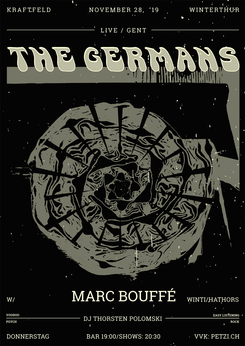 20:00 / Schau.platz / Beginn 20:30 / CHF 18/13* Live: The Germans (Gent) & Marc Bouffé (Hathors/Winti) Thorsten Polomski Voodoo, Psych-Easy Listening & Rock